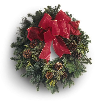 A naturally fragrant wreath to greet your guests. This wreath is made of mixed greens, pinecones, and a large red bow. Great for friends, family or business associates.
