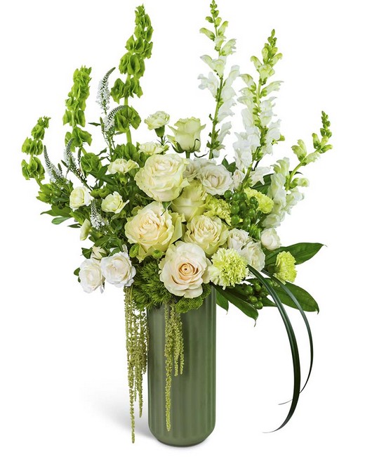 Cashmere Veil is an elegant arrangement of Roses, Snapdragons, Bells of Ireland, and premium foliage in soft ivory and green tones. Styled in a tall sage ceramic vase, it's a beautiful choice for sympathy flowers, anniversaries, or simply brightening someone's day. Each arrangement is thoughtfully designed, with seasonal substitutions made as needed to ensure freshness.